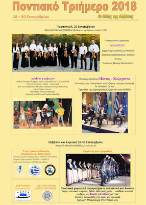 Ποντιακό Τριήμερο 2018 28 έως 30 Σεπτεμβρίου 2018 25 Σεπτεμβρίου, 20182 Φεβρουαρίου, 2023 athinapoli Παρασκευή, 28 Σεπτεμβρίου Δημοτικό Θέατρο Καλλιθέας (Φιλαρέτου & Κρέμου, έναρξη 19:30) Σάββατο & Κυριακή 29-30 Σεπτεμβρίου Κεντρική πλατεία Καλλιθέας, έναρξη 19:30 ΑΡΓΩ ΔΙΟΡΓΑΝΩΣΗ Παμποντιακός Σύλλογος