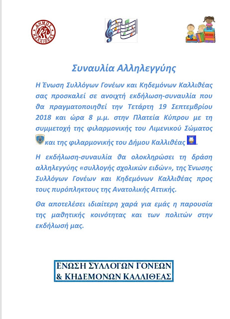 Η Ένωση Συλλόγων Γονέων και Κηδεμόνων Καλλιθέας συγκλονισμένη από τις πρόσφατες φονικές πυρκαγιές στην Αν. Αττική οργανώνει δράση στήριξης των παιδιών των περιοχών που επλήγησαν συλλέγοντας σχολικά είδη που θα αποσταλλούν προς τα παιδιά.