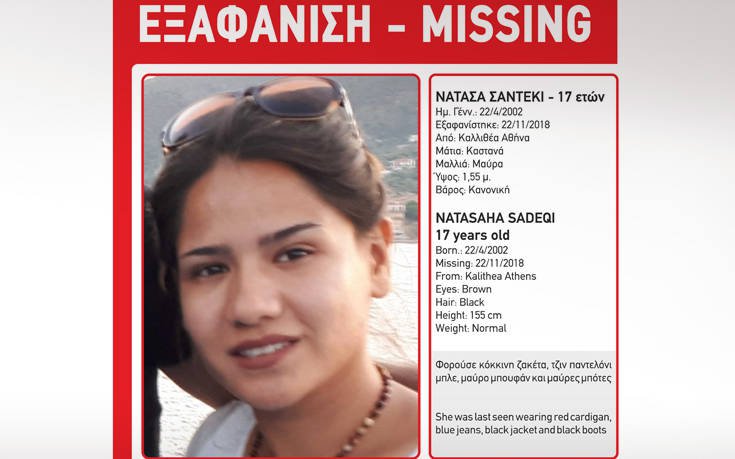 Από την περιοχή της Καλλιθέας στην Αθήνα εξαφανίστηκε στις 22 Νοεμβρίου 2018, στις 08:00 π.μ., η Νατάσα Σαντέκι, 17 ετών, αφγανικής καταγωγής.