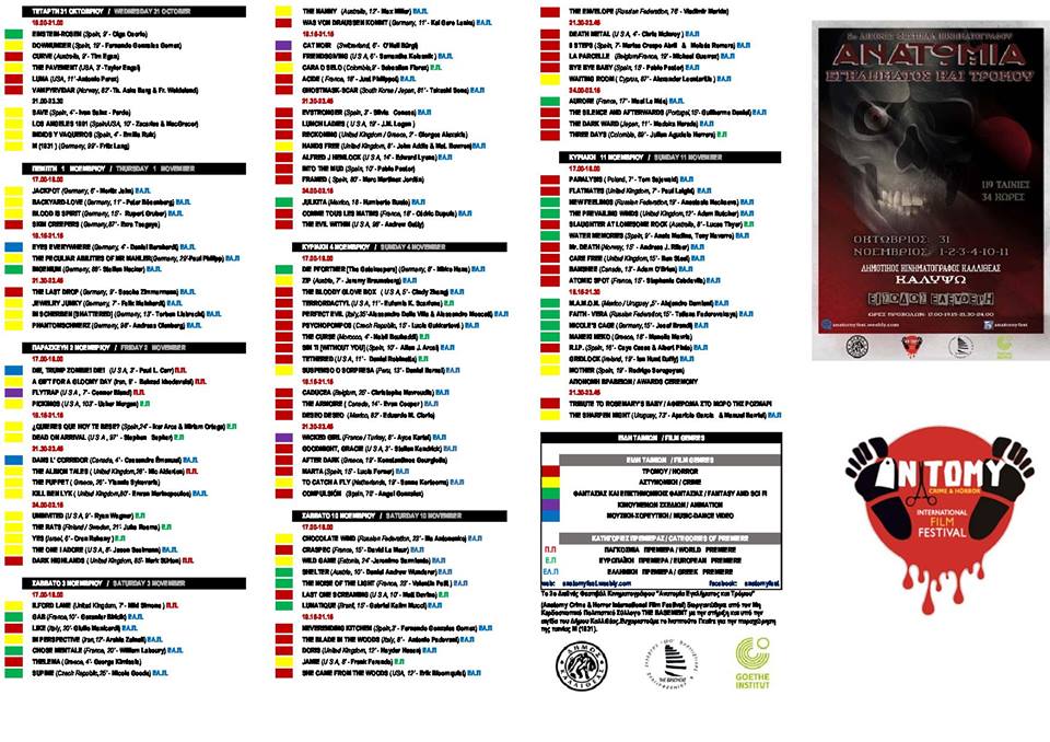 Ο πολιτιστικός και επιμορφωτικός σύλλογος «The Basement», μετά την επιτυχία του περσινού φεστιβάλ, διοργανώνει με τη στήριξη και υπό την αιγίδα του Δήμου Καλλιθέας, τo 2ο Διεθνές Φεστιβάλ Κινηματογράφου: Ανατομία Εγκλήματος και Τρόμου (Anatomy: Crime & Horror International Film Festival). Το φεστιβάλ ξεκίνησε την Τετάρτη 31 Οκτωβρίου και θα διαρκέσει έως και την Κυριακή 11 Νοεμβρίου (31 Οκτωβρίου και 1, 2,3, 4, 10 και 11 Νοεμβρίου) στον Δημοτικό Κινηματογράφο Καλλιθέας Καλυψώ.
