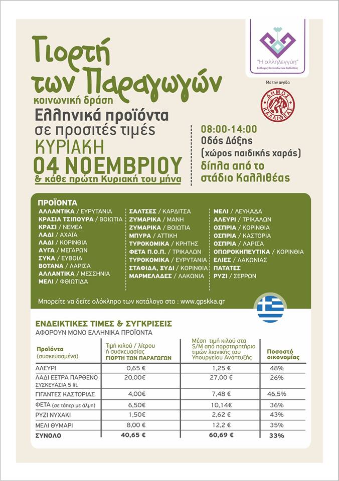 Την Κυριακή 4 Νοεμβρίου θα πραγματοποιηθεί η 4η Γιορτή Παραγωγών, με ποιοτικά ελληνικά προϊόντα σε χαμηλές τιμές. Από τις 8 το πρωί έως τις 2 το μεσημέρι στην οδό Δόξας στην παιδική χαρά δίπλα στο Δημοτικό Στάδιο Καλλιθέας