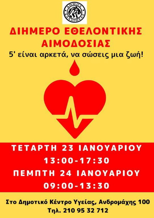 Aιμοδοσία για την ενίσχυση της τράπεζας αίματος του Δήμου Καλλιθέας, θα πραγματοποιηθεί: