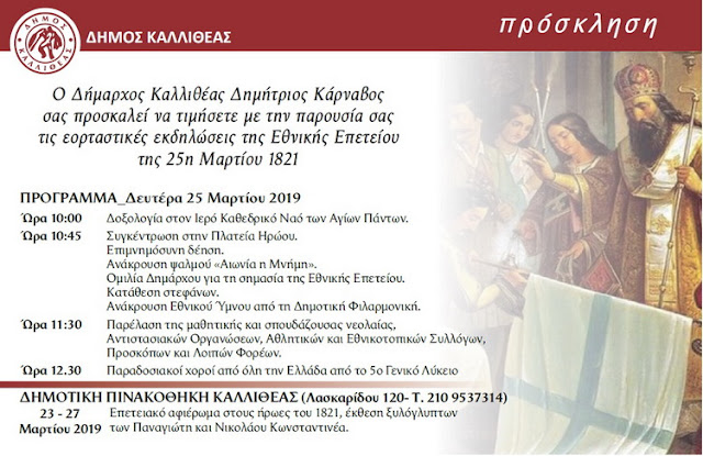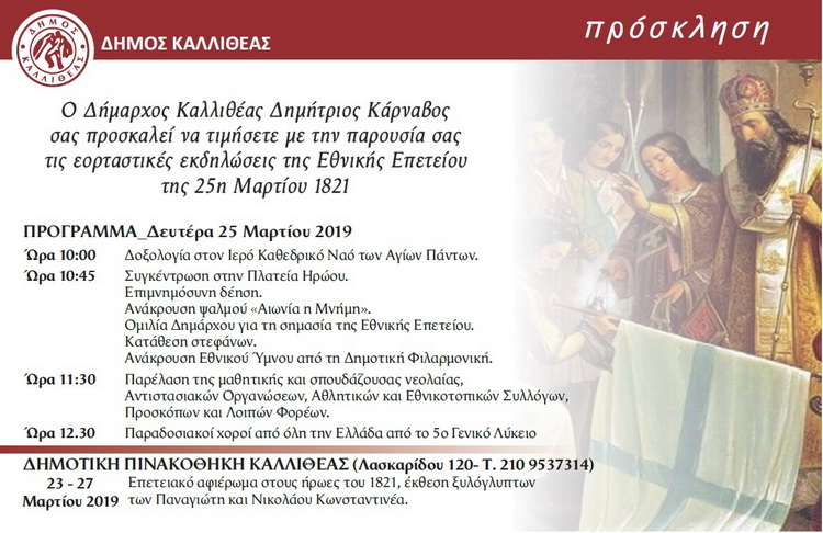 Ο Δήμαρχος Καλλιθέας Δημήτριος Κάρναβος σας προσκαλεί να τιμήσετε με την παρουσία σας τις εορταστικές εκδηλώσεις της εθνικής επετείου της 25ης Μαρτίου 1821