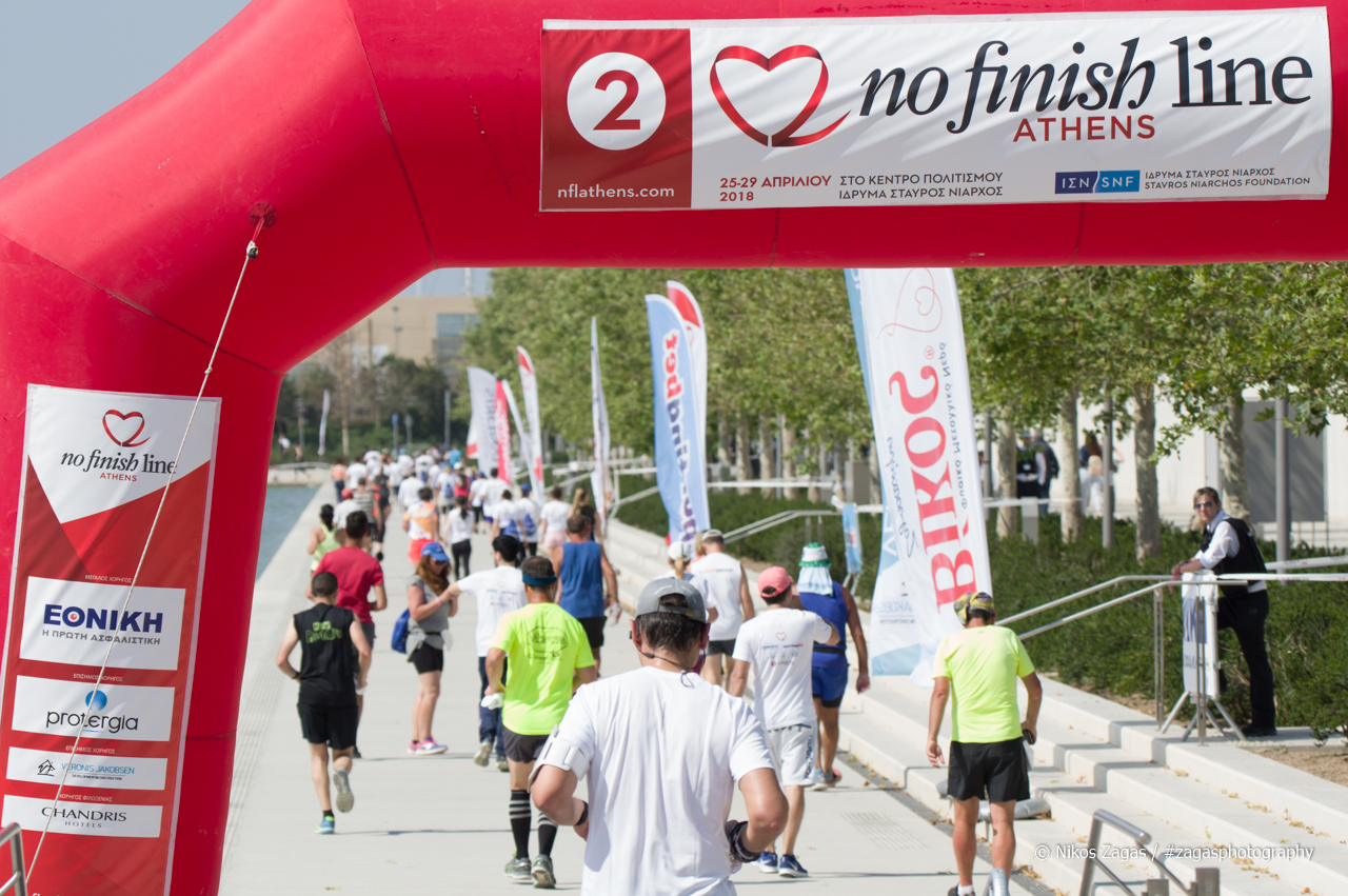 Το No Finish Line της Αθήνας πραγματοποιείται σε συνεργασία με το Κέντρο Πολιτισμού Ίδρυμα Σταύρος Νιάρχος. Θα αρχίσει την Τετάρτη 10 Απριλίου στις 19:00 και ολοκληρώνεται την Κυριακή 14 Απριλίου στις 13:00 και μέσα σε αυτό το διάστημα στον 90ωρο ατομικό Φιλανθρωπικό Αγώνα οι συμμετέχοντες πληρώνοντας 7 ευρώ, μπορούν να περπατήσουν ή να τρέξουν ότι ώρα θέλουν, όποια στιγμή της ημέρας ή της νύχτας θέλουν, για όσες φορές και ημέρες θέλουν, με όποιο τρόπο και ρυθμό θέλουν και για όση διάρκεια θέλουν, μέσα στην κυκλική διαδρομή 1000μ. γύρω από το Κανάλι του Κέντρου Πολιτισμού Ίδρυμα Σταύρος Νιάρχος για να προσφέρουν χρήματα καταγράφοντας χιλιόμετρα.