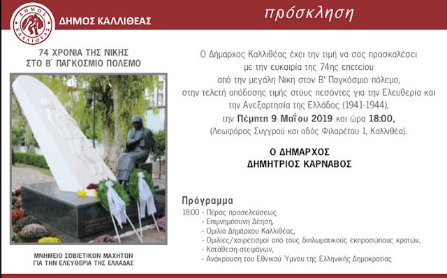 Ο Δήμαρχος Καλλιθέας έχει την τιμή να σας προσκαλέσει με την ευκαιρία της 74ης επετείου από την μεγάλη Νίκη στον Β’ Παγκόσμιο πόλεμο, στη τελετή απόδοσης τιμής στους πεσόντες για την Ελευθερία και την Ανεξαρτησία της Ελλάδος (1941-1944), την Πέμπτη 9 Μαΐου 2019 και ώρα 18:00 (Συμβολή Λεωφ. Συγγρού και οδού Φιλαρέτου 1, Καλλιθέα)
