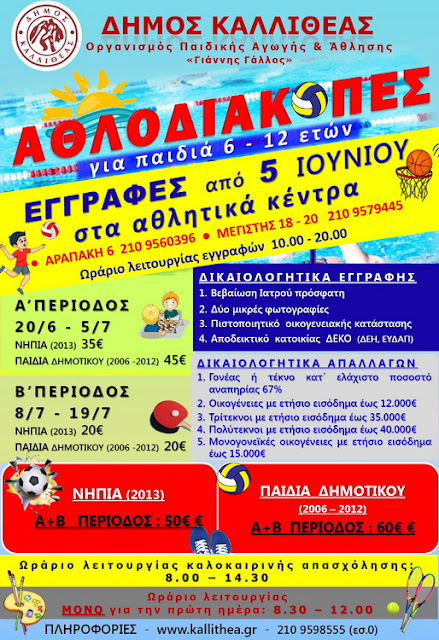 Για 14η συνεχή χρονιά θα λειτουργήσει η Καλοκαιρινή Απασχόληση του νπδδ ΟΠΑΑ ¨ΓΙΑΝΝΗΣ ΓΑΛΛΟΣ¨ του ΔΗΜΟΥ ΚΑΛΛΙΘΕΑΣ για τα παιδιά που είναι γεννημένα από 1-1-2006 μέχρι 31-12-2013.