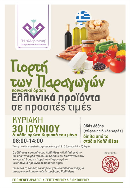 με τnν αιγίδα του Δήμου Καλλιθέαs διοργανώνει τnν κοινωνική δράσn «Γιορτή των Παραγωγών» με ελλnνικά προϊόντα σε προσιτέs τιμέs.