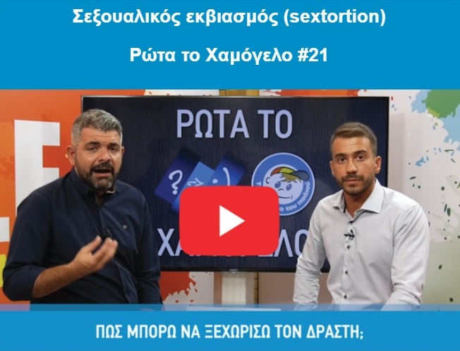 Ο σεξουαλικός εκβιασμός (sextortion) είναι ένα θέμα που αφορά Παιδιά κι ενήλικες εντονοτερα δυστυχώς στις ημέρες μας. Δείτε στην εκπομπή “Ρώτα το Χαμόγελο” τους ψυχολόγους του Οργανισμού μας Στέφανο και Γιάννη να απαντάνε σε δικές σας ερωτήσεις σχετικά με αυτό το φαινόμενο. Στείλτε μας όποια σχετική ερώτηση ή απορία  έχετε στα comments για να σας τις απαντήσουμε.