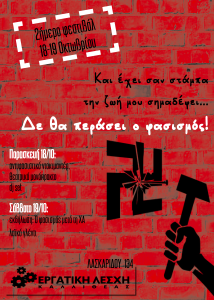 Η Εργατική Λέσχη Καλλιθέας σας καλεί να συμμετάσχετε στις εκδηλώσεις του 2ημέρου που διοργανώνει στις 18 και 19 Οκτωβρίου με θέμα την αντίσταση στη φασιστική απειλή και στη συζήτηση που θα διεξαχθεί τη δεύτερη μέρα του διημέρου και θα μιλήσουν αγωνιστές και αγωνίστριες αντιφασιστικών και αντιρατσιστικών οργανώσεων.