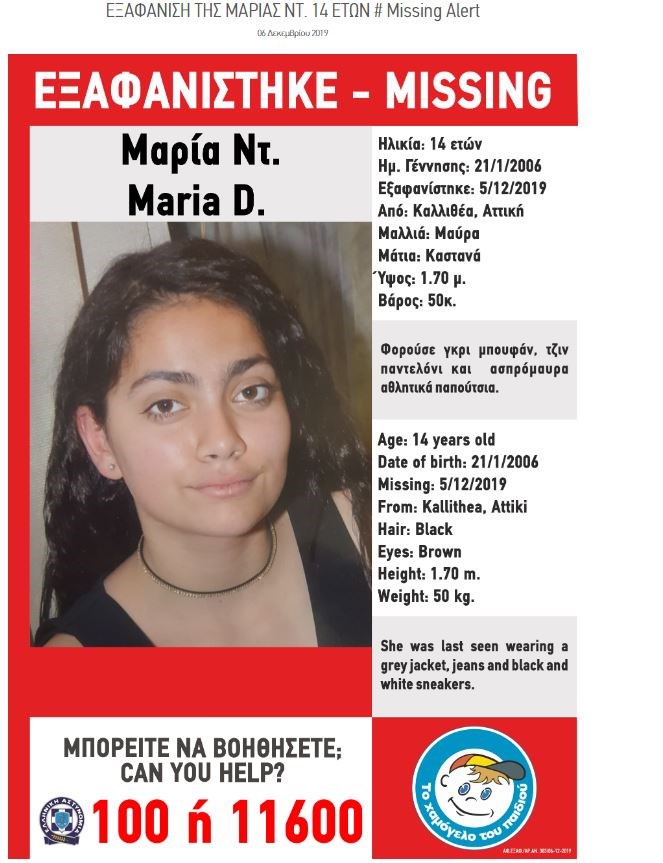 Σύμφωνα με την ανακοίνωση που εξέδωσε το «Χαμόγελο του Παιδιού» στις «05/12/2019 και ώρα 14:00, εξαφανίστηκε από την περιοχή της Καλλιθέας, η Μαρία Ντ., 14 ετών.