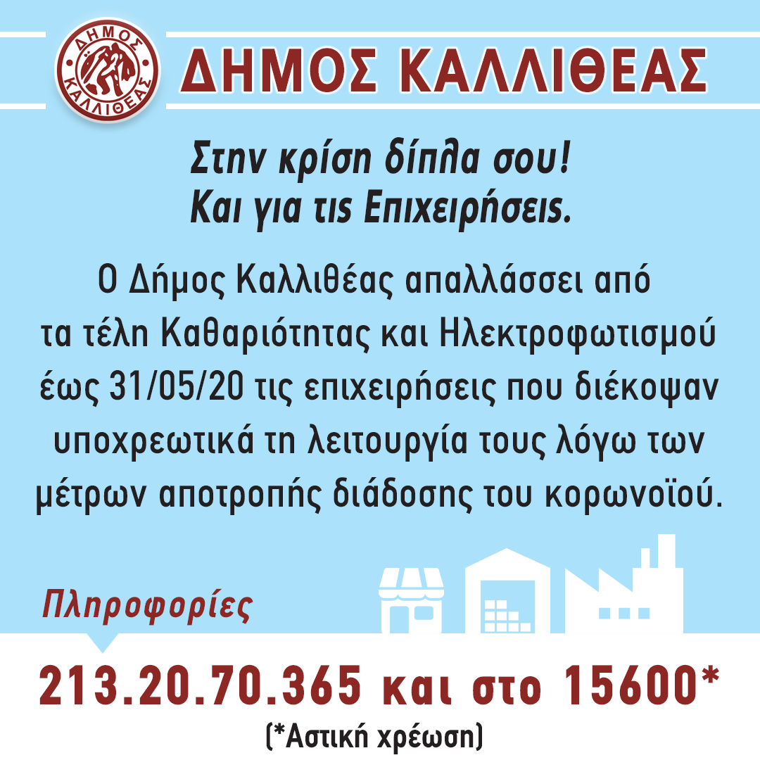 Πληροφορίες στο 2132070365, στο 15600 και στην ιστοσελίδα μας: Έκτακτες οικονομικές ελαφρύνσεις για την ανακούφιση των επιχειρήσεων της Καλλιθέας – Δήμος Καλλιθέας