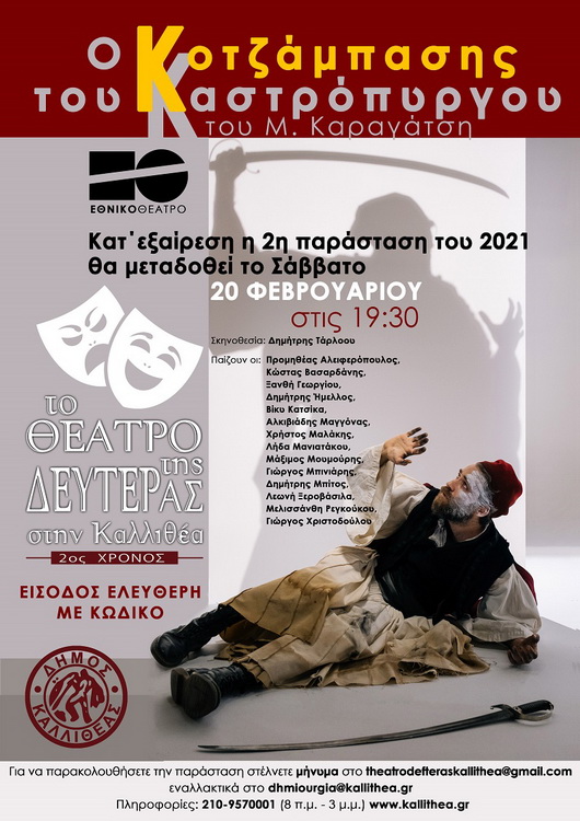 Κατ’ εξαίρεση η 2η διαδικτυακή παράσταση του 2021 θα μεταδοθεί το Σάββατο 20 Φεβρουαρίου στις 19:30. Το έργο είναι Ο ΚΟΤΖΑΜΠΑΣΗΣ ΤΟΥ ΚΑΣΤΡΟΠΥΡΓΟΥ του Μ. Καραγάτση σε σκηνοθεσία Δημήτρη Τάρλοου.