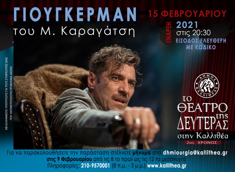 Με τον ΓΙΟΥΓΚΕΡΜΑΝ του Μ. Καραγάτση, σε σκηνοθεσία Δημήτρη Τάρλοου και με τον Γιάννη Στάνκογλου στον ομώνυμο ρόλο, ξεκινούν στις 15 Φεβρουαρίου, οι φετινές παραστάσεις του «Θεάτρου της Δευτέρας στην Καλλιθέα», διαδικτυακά.