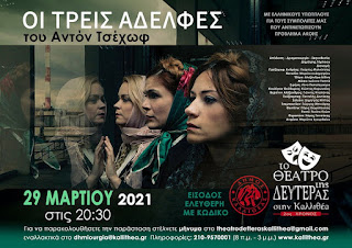 Με την παράσταση «Οι Τρεις Αδελφές» του Αντόν Τσέχωφ, σε σκηνοθεσία Δημήτρη Τάρλοου, συνεχίζουμε στις 29 Μαρτίου και ώρα 20:30, το πρόγραμμα του «Θεάτρου της Δευτέρας στην Καλλιθέα», διαδικτυακά.